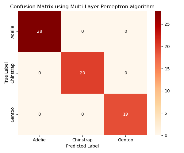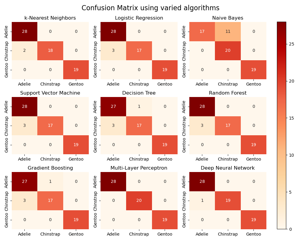 other algorithms had a limited number of misclassifications, primarily between Adelie and Chinstrap.