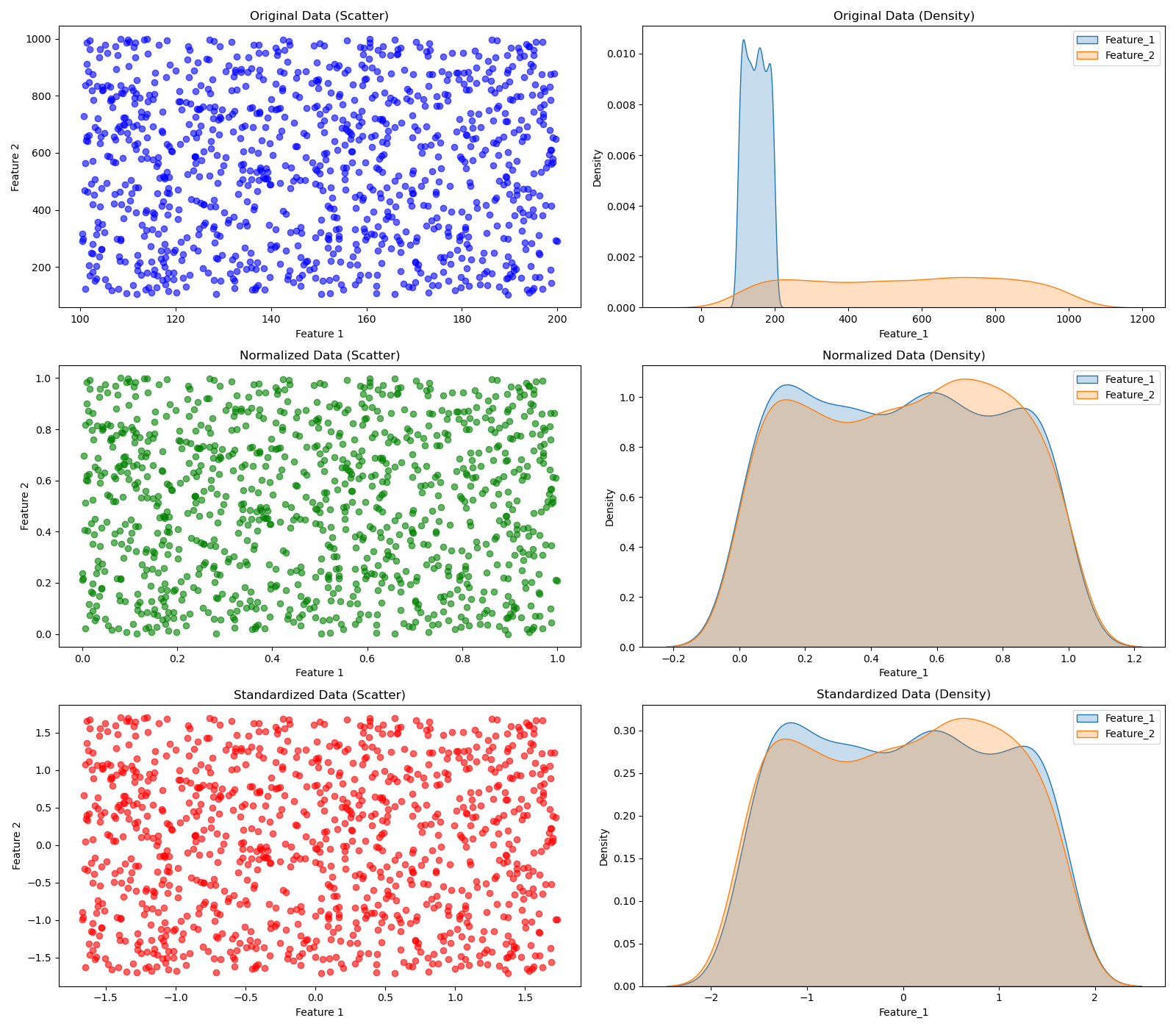 \[X\_scaled = \frac{X - \mu}{\sigma}.\]Standardization is less affected by outliers than Min-Max scaling and is often the preferred choice for algorithms that assume data is centered (like SVM and PCA).