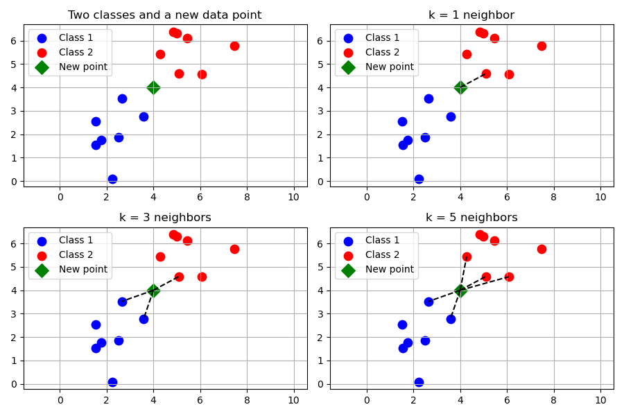 Below is an example illustrating how KNN determines the class of a new query point. Given a query point, KNN first calculates the distance between this point and all points in the training set. It then identifies the k closest points, and the class that appears most frequently among these neighbors is assigned as the predicted label for the query point. The choice of k plays a crucial role in performance: a small k can make the model overly sensitive to noise, while a large k may oversmooth the decision boundaries and obscure important local patterns.