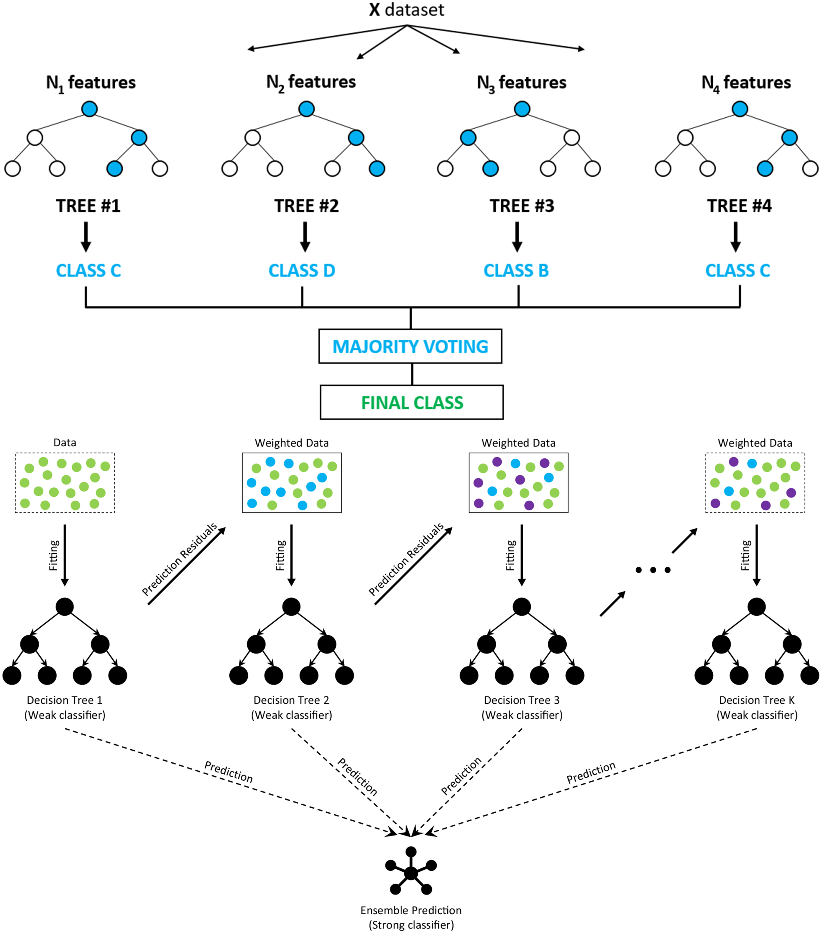In binary classification, the model predicts one of two classes, such as spam or not spam for emails. Multiclass classification extends this to multiple categories, like classifying images as cats, dogs, or birds.