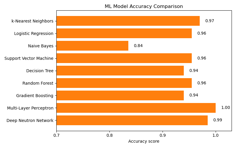Naive Bayes showed slightly lower accuracy, likely due to its strong independence assumption between features, which does not fully hold in this dataset.