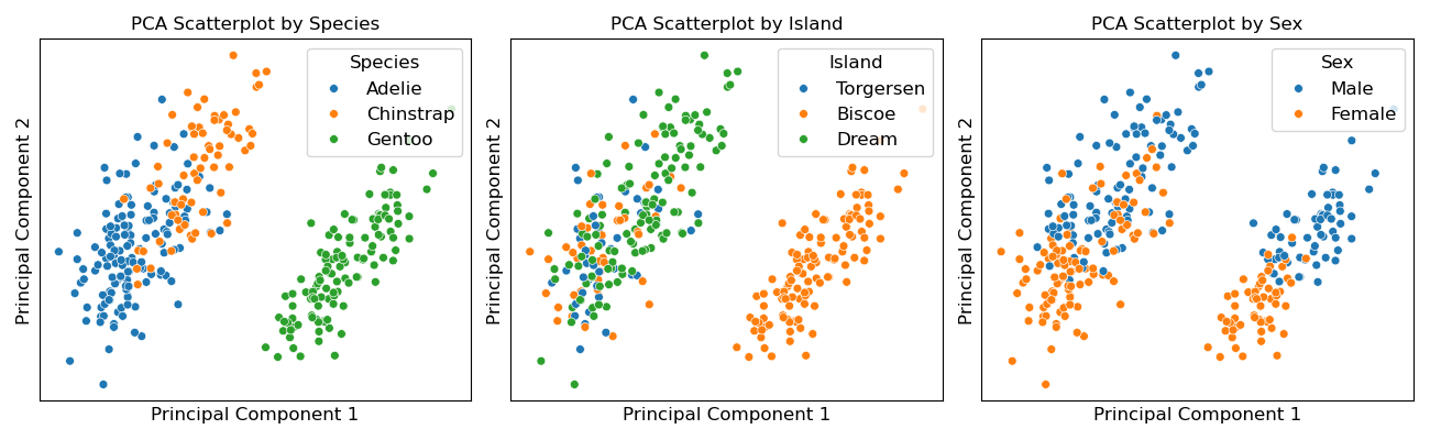By plotting the two components, we can examine how penguins cluster in this reduced space.