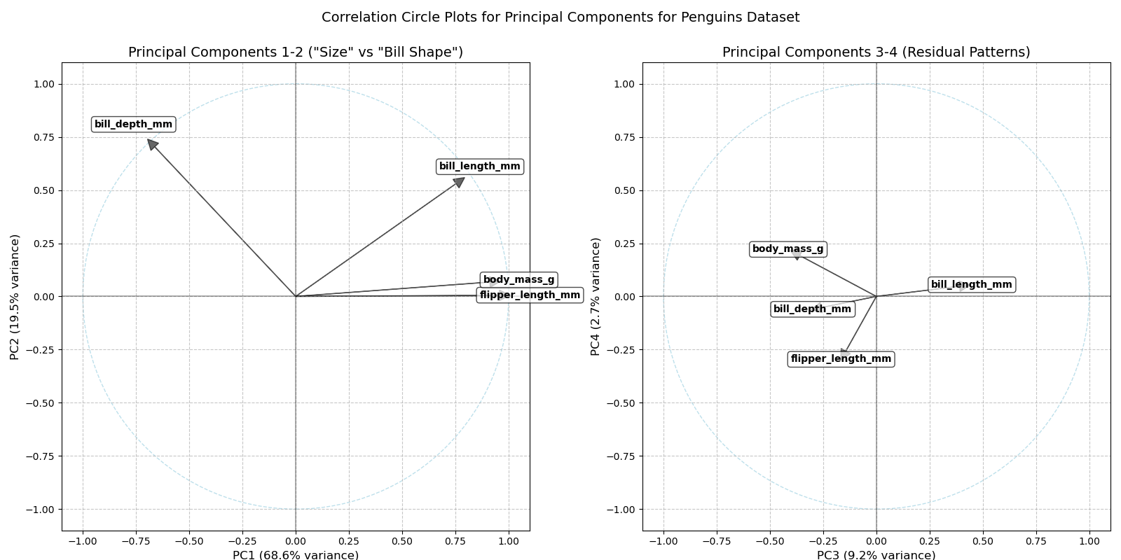 By analyzing the PCA loadings, we can see that the first two principal components explain approximately 90% of the total variance in the Penguins dataset. This indicates that most of the important information in the original four features is already captured by these two components. Consequently, we can conclude that reducing the dataset to two principal components is sufficient for visualization and analysis, striking a balance between simplicity and information retention while effectively summarizing the underlying structure of the data.