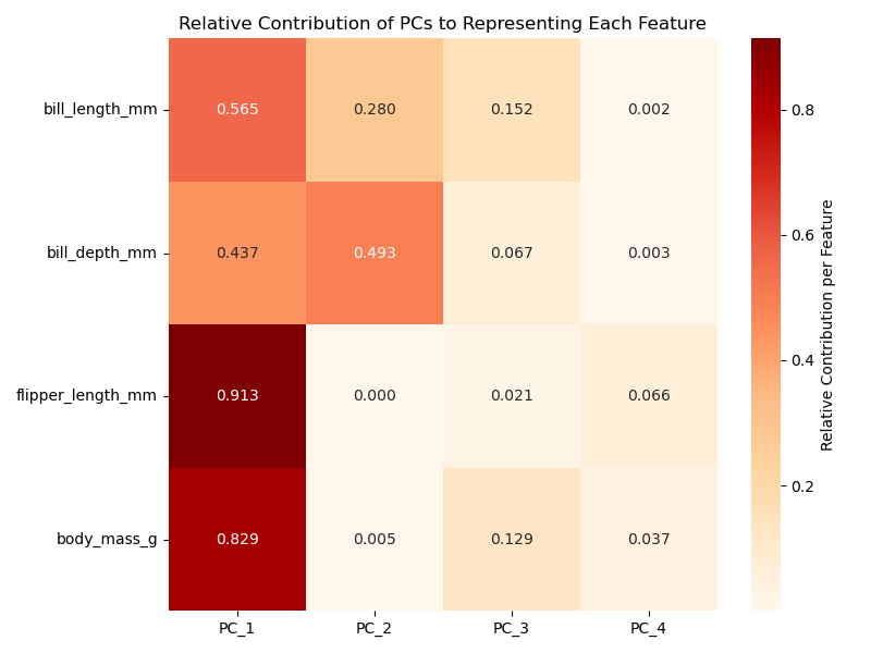 This allows us to examine and visualize in detail how each original penguine feature contributes to the four principal components. As discussed in the previous subsection, each principal component is a linear combination of the original features and can be expressed mathematically as follows: