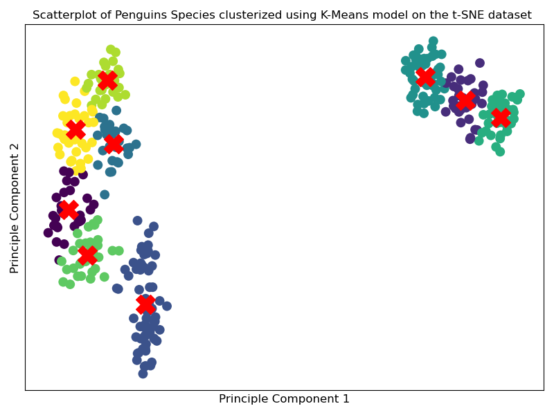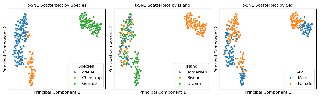 After fitting the t-SNE model, we can visualize the Penguin dataset in two dimensions, allowing us to explore the relationships between individual data points, identify potential clusters, and observe how different species are distributed across the embedding.