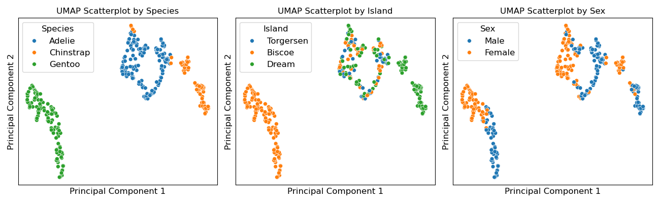 Using the same procedure as in the t-SNE subsection, we build and fit the UMAP model, and visualize the Penguin dataset in two dimensions by species, island, and sex.